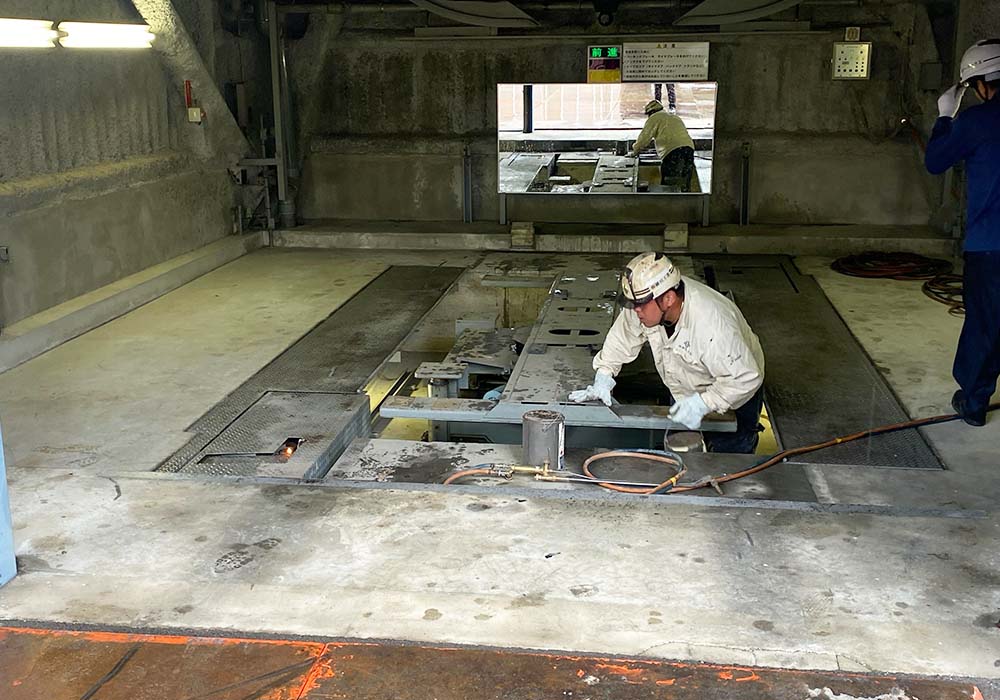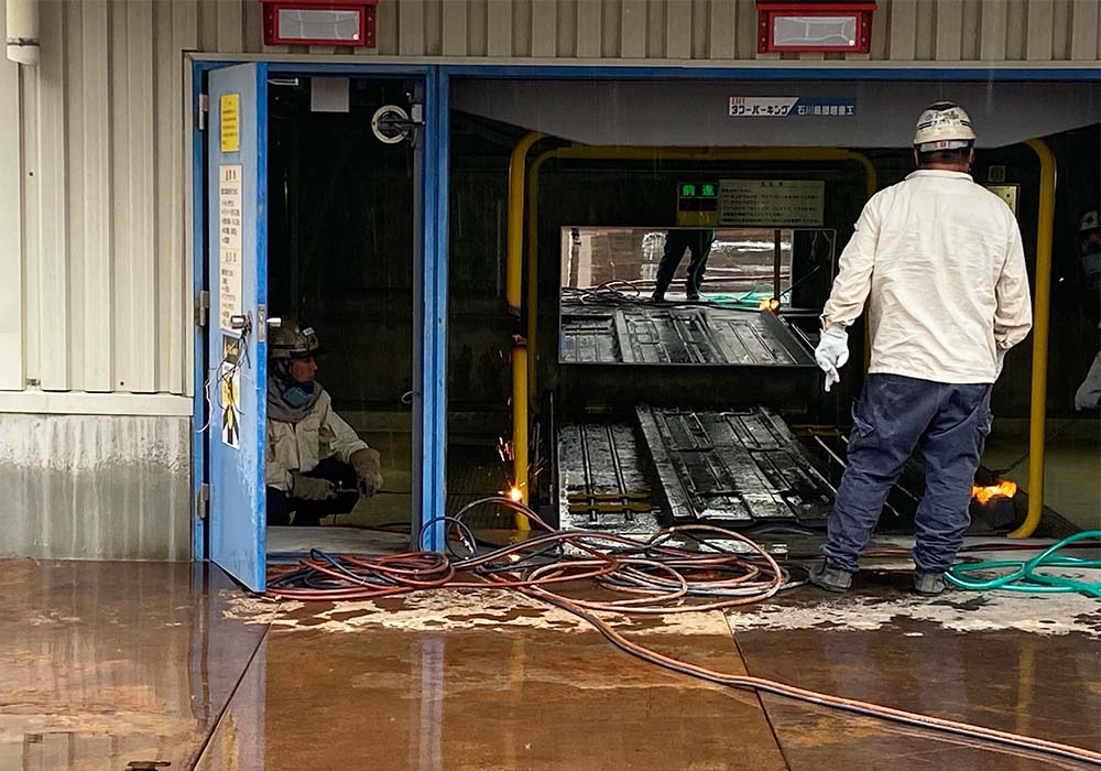 続いて、車両を積載するパレットを酸素ガスを使用して切断していきます。