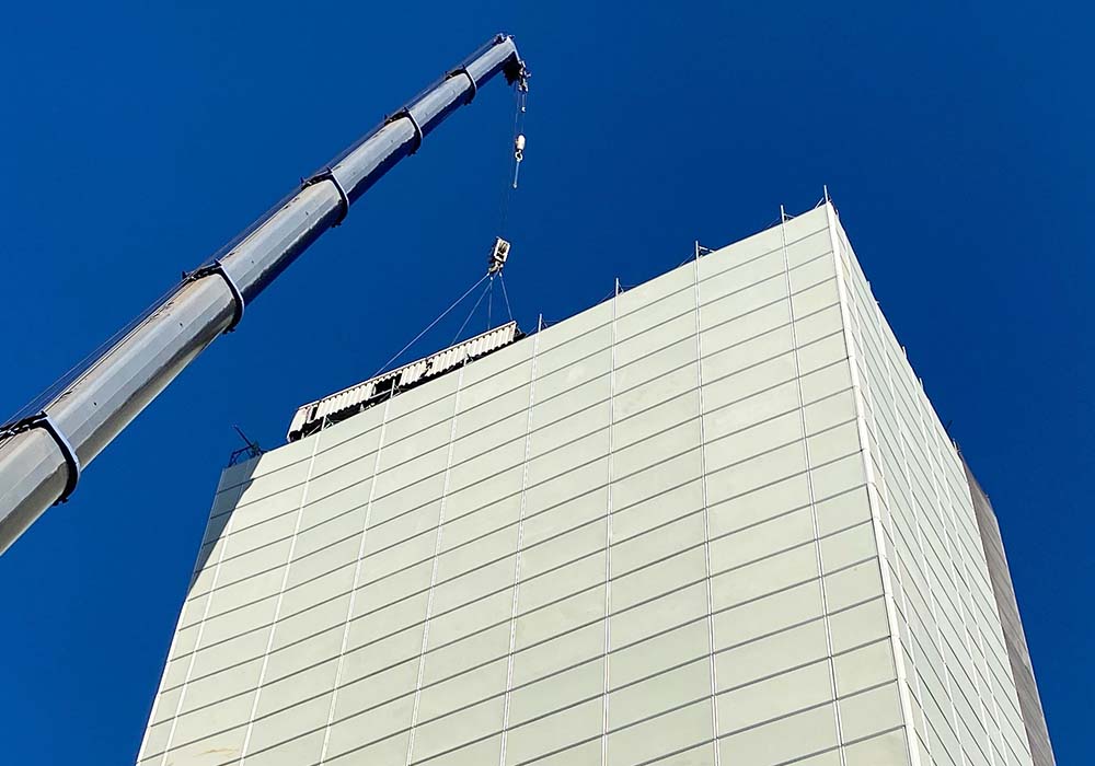 パレットを全て搬出できたら、チェーンとワイヤーを撤去してタワーの中を何もない状態にしてから、鉄骨の構造体をクレーンで撤去していきます。
