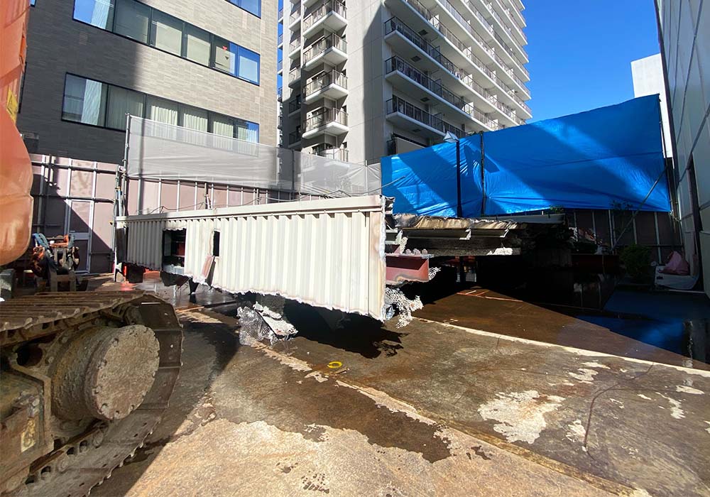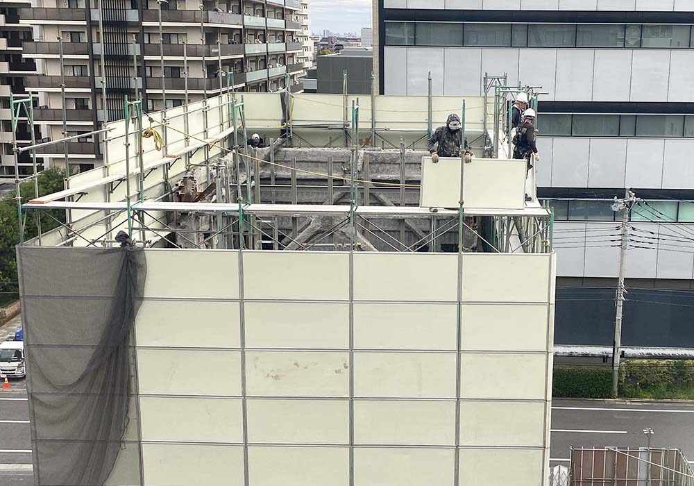 また、高所作業のため、養生パネルの設置、クレーン作業の安定性、そして地下のPIT構造がある場合には、埋め戻し作業、構造にアスベストがある場合の処理など、総合的な解体施工の対応が必要になってきます。